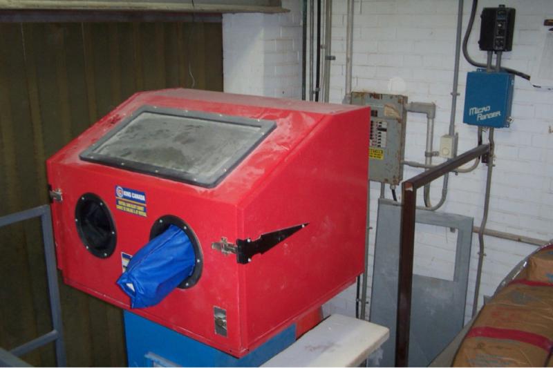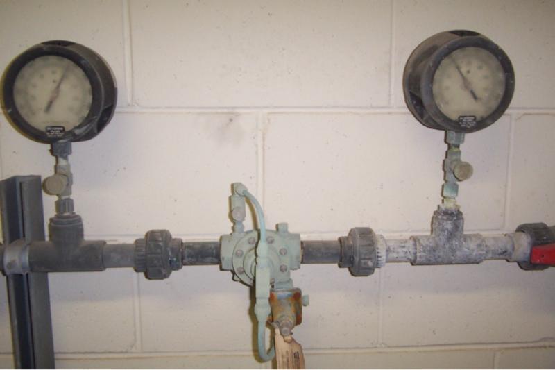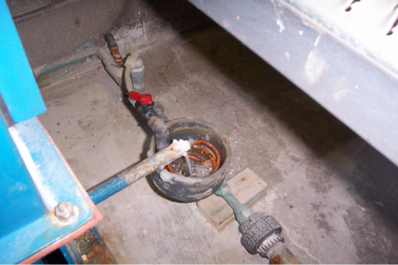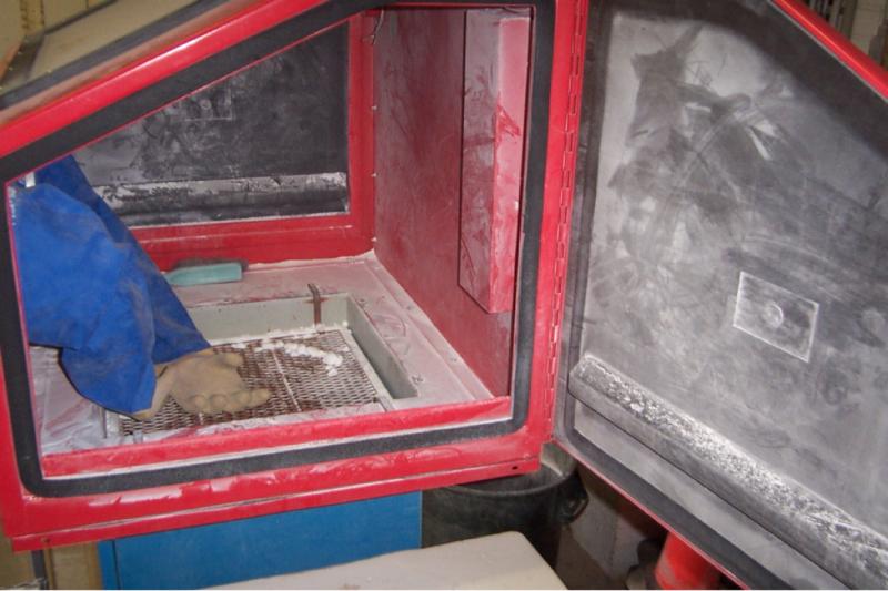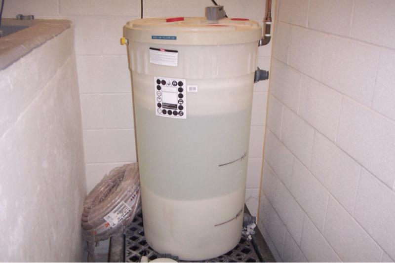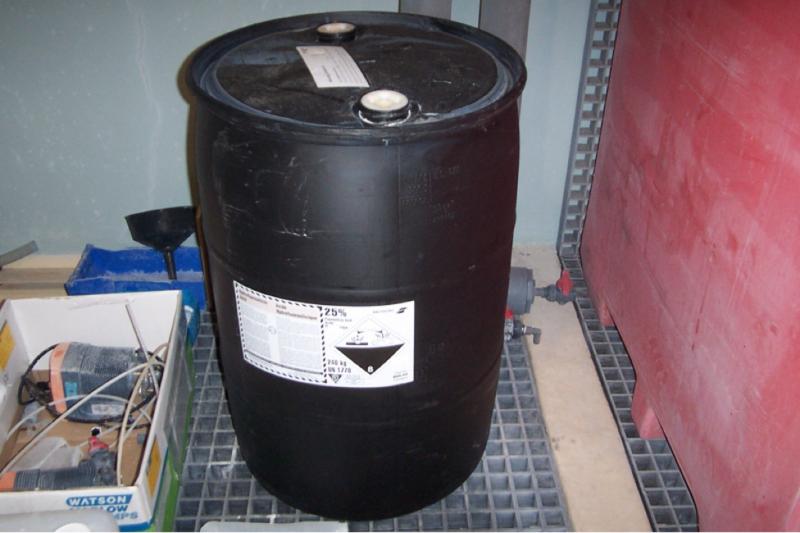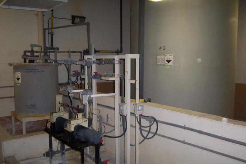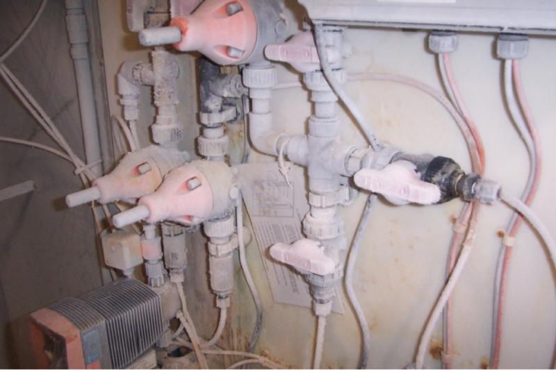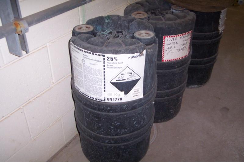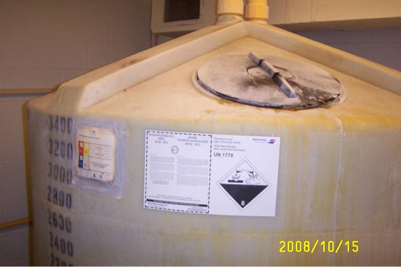 Corrosion due to fugitive emissions of hydrogen fluoride gas venting from the HFSA bulk tanks is evident as a white powdery deposit over equipment.